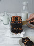 A soft and tender chocolate and almond cake layer, stuffed with a light butter and salted nutty interior. Finished off with whole almonds and a dusting of gold.